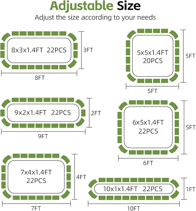 - 【 Adjustable size design 】 The GoCampDirect raised flower beds Kit features an innovative modular design and is available in 7' x 4'x1', 8 'x 3'x1', 9 'x 2'x1', 10 'x 1'x1', 6 'x 5'x1' and 5 'x 5'x1' configurations. This way, you can assemble the garden beds outdoor into a variety of arrangements based on your backyard, enabling you to create different sized raised flower bed according to your gardening plan.