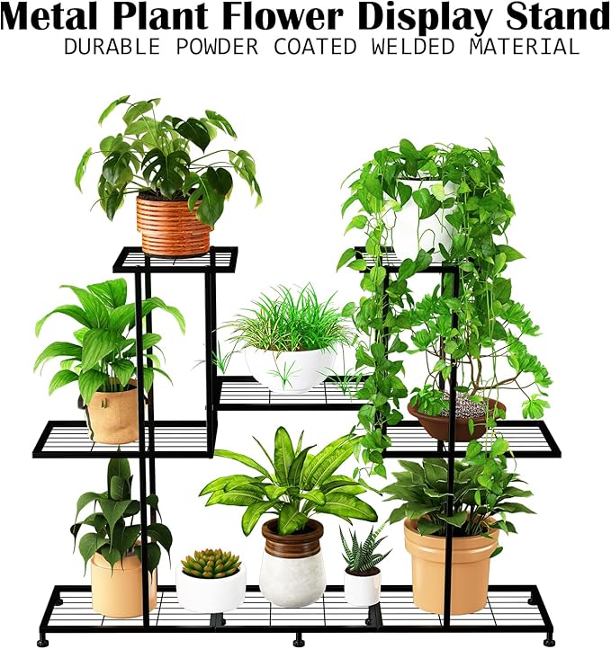 - 【4 TIER LARGE CAPACITY】size: W 43.8 x H 32.2 x D 9.8 inch,Each rack is wide and spacious enough to hold most pots.Multi layer high and low garden plant shelf with opening design,no shelter from each other,easy to handle and water,helps plants get enough sunlight for growth.(The plant organizer can hold up to 12 pot plants.)Space-saving, you can place in corner of the living room, garden, balcony and bedroom. Perfect for decorating your home.