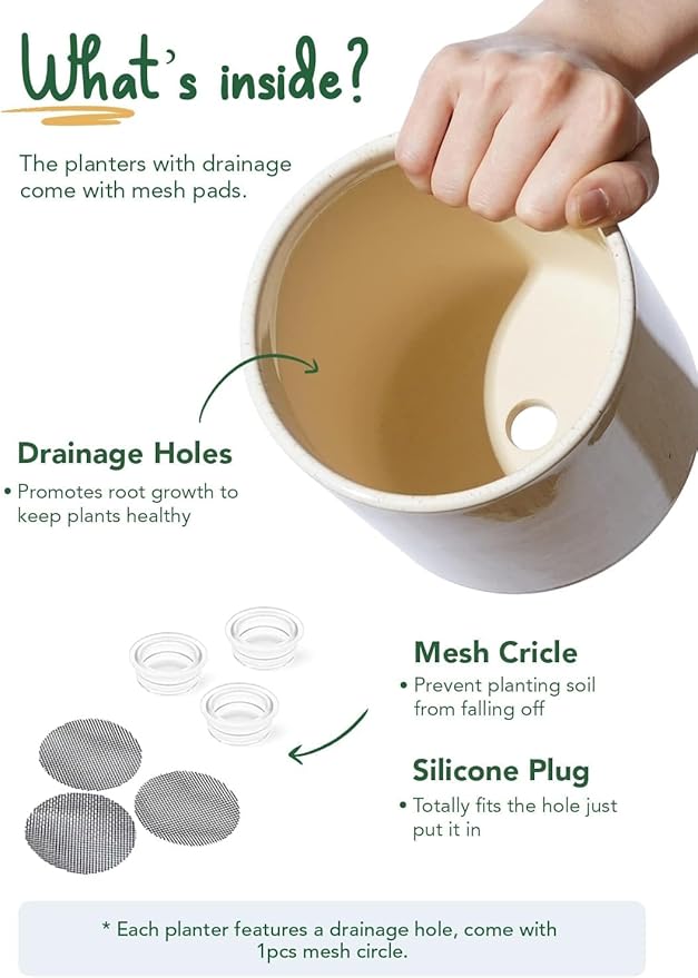 - Thoughtful Accessories: To drain or not to drain, it's all up to you; roots love moisture but are afraid of excessive water; use a silicon plug to prevent water leakage, or cover the drainage hole with a mesh pad to prevent soil loss, offering good ventilation for plants to breathe without restriction (Plant is NOT included)