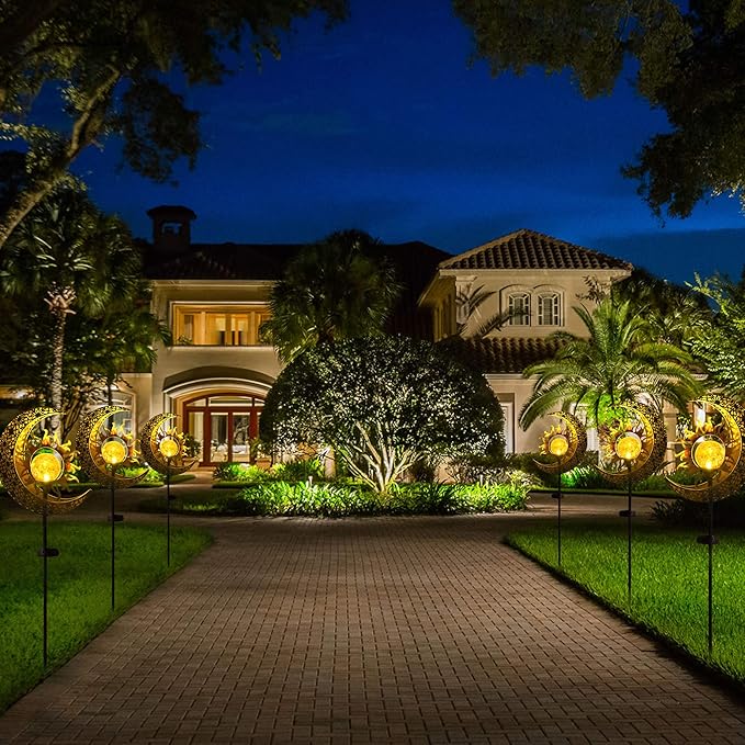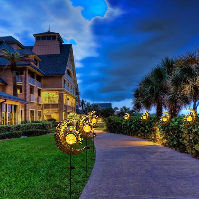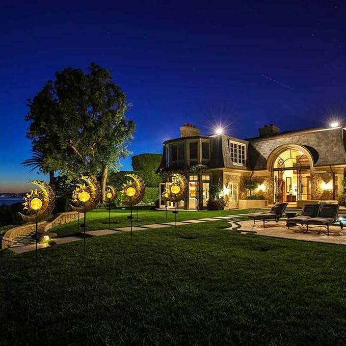 - OUTDOOR DECORATIONS GIFT IDEAS: These decorative stakes design with sun, moon showcase warm white LED lights that create a beautiful reflection of patterns when illuminated. They add an enchanting landscape lighting to your home outside, lawn, patio, garden, backyard, or pathway, enhancing the visual appeal of your outside space.