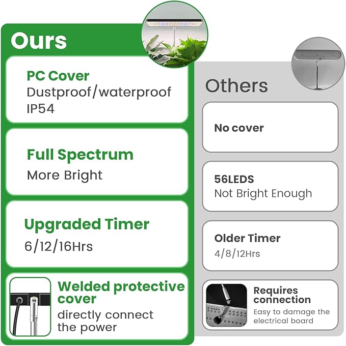 - Upgraded Desk Grow Light: Our grow lamp is equipped with PC cover, and a protective sleeve is welded to the lamp board interface. Not only is it dustproof, it also provides safe lighting protection. 5.2 inch metal base and anti-slip pads ensure stability.