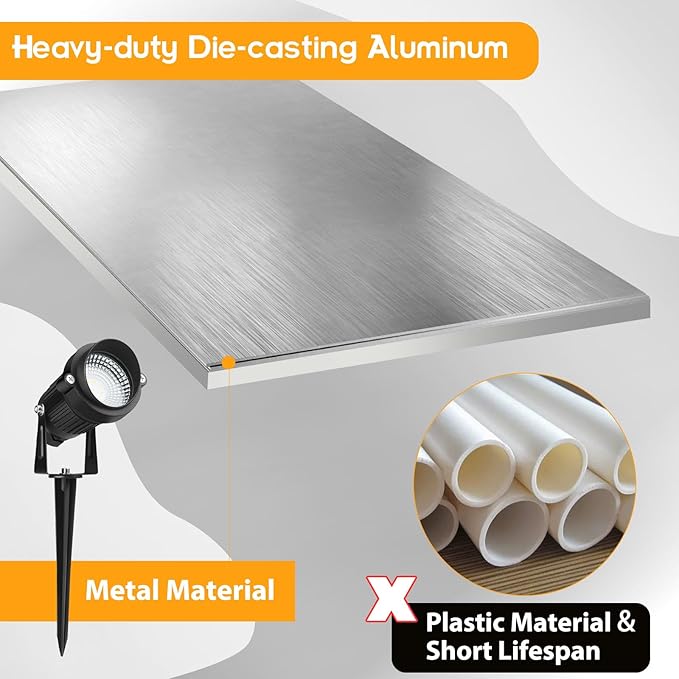 - Sturdy & non-deformable light construction. Whole light is made of aluminium, including stakes; dear customer, you can count on the quality of this lights'. IP65 waterproof for most weather conditions.