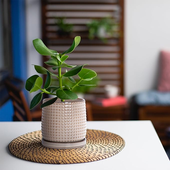 D'vine Dev 6 Inch 4 Inch Ceramic Indoor Planter Pots with Drainage Hole and Saucer, Beaded Design Flower Pots, Set of 2, Light Brown, 27-D-U-4