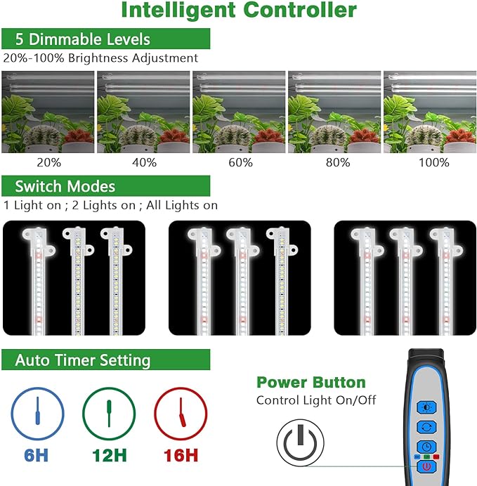 - 3 switching functions and 5 brightness: Press button for 5 Dimmable , no need to worry about burning plants. It also have 3 switching functions of the light bar, “A light on, B light on, All light on”. Suitable for both home, office.