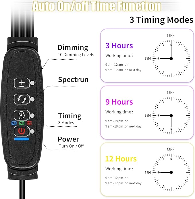 - 【Timing Function】 : Grow lights have cyclic memory timing function, the product will automatically open and close, you can set 3 hours, 6 hours, 12 hours, do not need manual operation, can take better care of the plant.