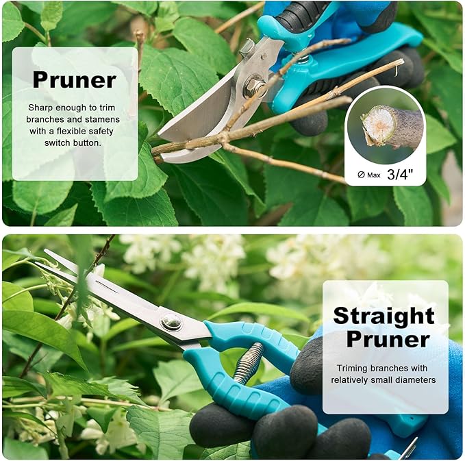 • 𝟏𝟏 ππˆπ„π‚π„ 𝐆𝐀𝐑𝐃𝐄𝐍 π“πŽπŽπ‹ 𝐒𝐄𝐓𝐒: Our premium gardening tool set can meet most gardening needs, which includes a large trowel, small trowel, cultivator, hand rake, weeder, pruning shears,pruner,wedding knife, gloves, Thickened Repotting mat,and an enlarger oxford cloth tote to keep them all organized. These tools are robust and made to last, with stainless steel blades that can cut through even thick weeds with ease