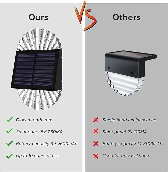 - 【Solar Powered Step Lights】The solar lights outdoor are environment-friendly, powered by the sunlight. It only takes about 4-5 hours of the sun to fully charge, after that they can work about 8-10 hours long consistently, perfect outdoor lights for steps.