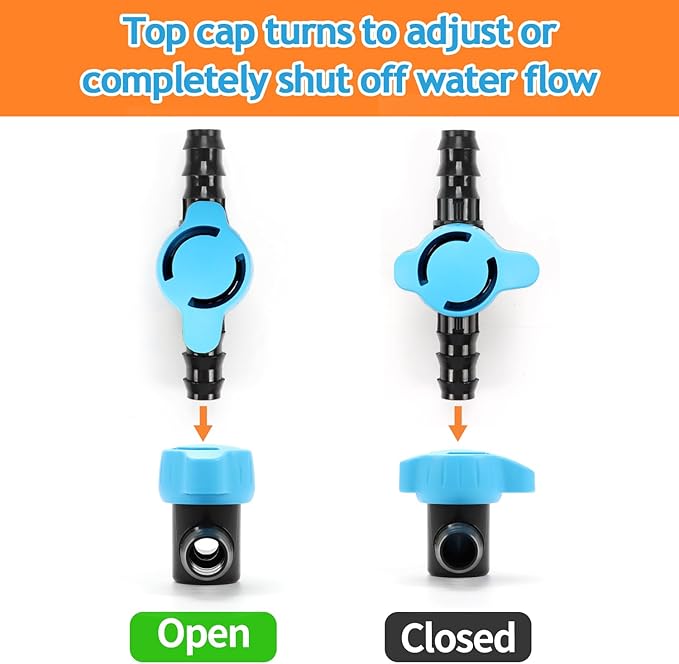 - Value Pack: The package includes 12 pcs drip irrigation shutoff valves for generic 1/2" drip irrigation tubing, used to control water flow to individual plants and container gardening.