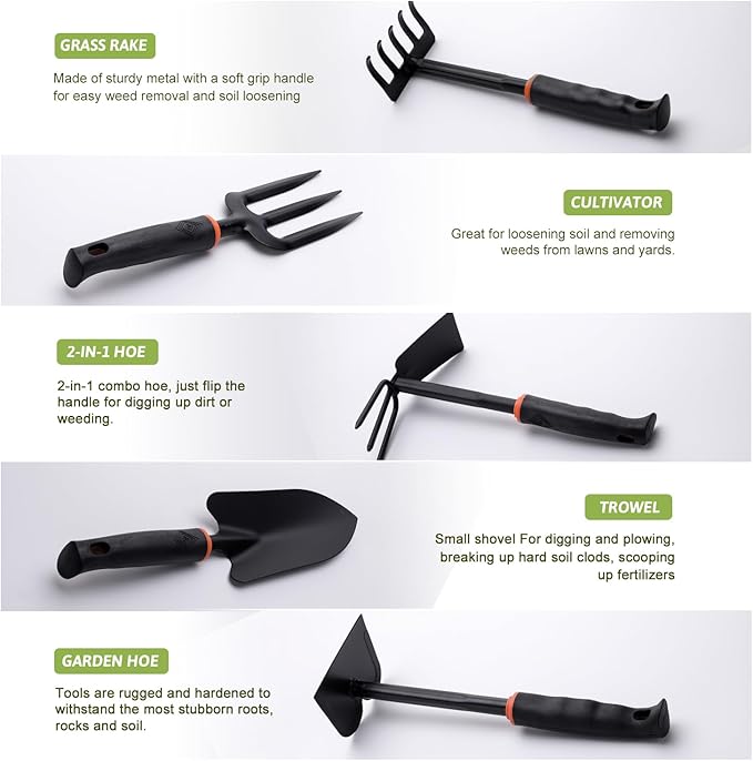 - Ergonomic handle design: Garden hand tools set handle is made of high quality rubber, Comfortable and non-slip, Easy to grip for both large and small hands, Reduce the pressure on your wrist and hand, Won't make you fatigue, Suitable for long time use