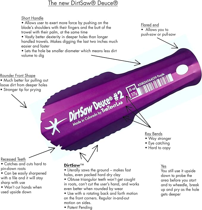 - The NEW DirtSaw Deuce (patent pending), redefines what an ultralight backpacking and camping trowel is and how it’s used. The DirtSaw literally saws the ground with teeth that are specifically designed to cut dirt without snagging on roots or threatening to cut your hand. You’ll use it use it upside down (!), sideways, and the “regular way” as you probe, pry, saw and scoop your way to a true Leave-No-Trace 6-8” deep hole.