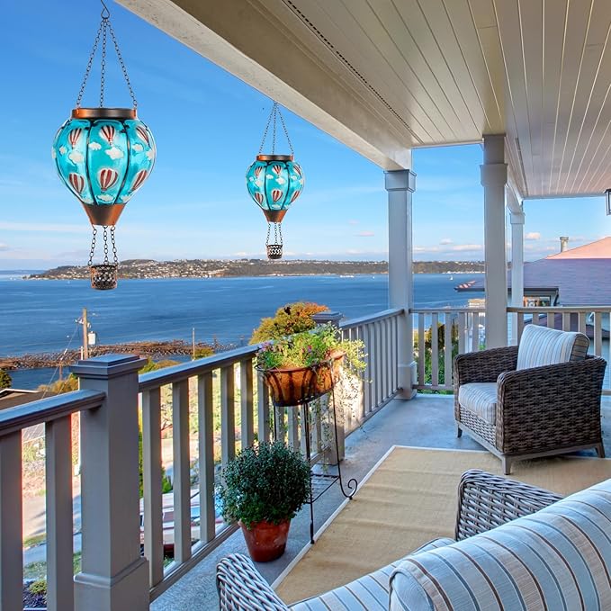 - 【High Quality】Our glass hot air balloon solar lanterns have excellent waterproof performanceand can stand up to any weather. The 18.1-inch solar hot air balloon lantern with flame has an "S" hook, which can be easily hung on the porch, tree, gazebo, balcony or ledge as a beautiful landscape.