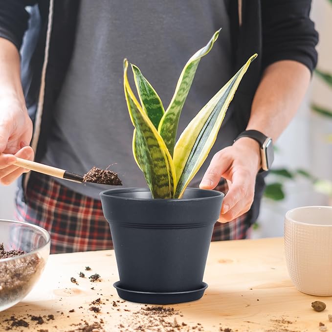 6 inch Nursery Pots, Seedling Pots, 16 Pack Plant Pots for Indoor Outdoor Plants, Flower Pots with Drainage Holes and Saucers, Decorative Plastic Planters for Home Small Plants, Black