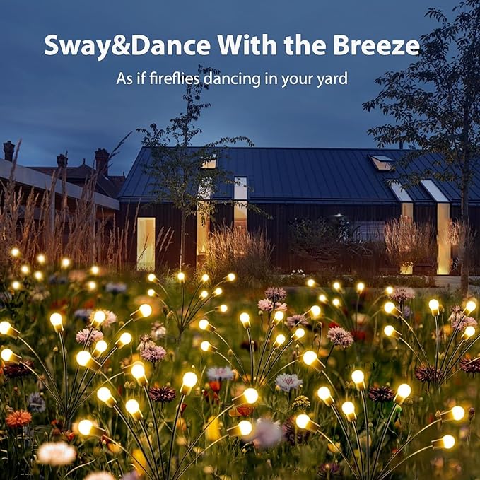 - New Upgraded Swaying Solar Firefly Lights: This Garden Lights are designed with flexible branches and 8 LED Bulbs, which can sway and dance with the wind and looks like fireflies flying in the courtyard. The solar Christmas outdoor lights have 2 lighting modes ( Steady On and Flash Mode) which can add a lot of vitality to your garden, and create a romantic atmosphere.