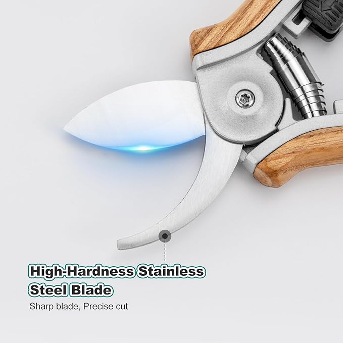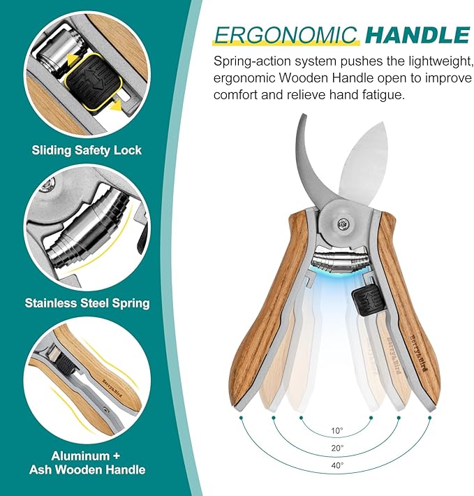 - Reduce Hand Strain: The pruning shears have a built-in high-resilient steel spring, which opens automatically and is easy to work. The ergonomically designed ash wooden handle fits the curvature of the palm better, and is soft and non-slip, making you feel more comfortable. The overall scissors have good impact resistance, which can effectively buffer the vibration generated by pruning and reduce hand fatigue during use. It's a pair of gardening shears that are very suitable for long-term pruning work!