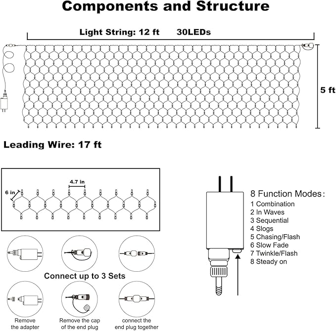 - Christmas Net Mesh Lights: Red net decorative lights, come with super bright 360 LEDs and UL Certified adapter. Low voltage plug, safety voltage for human body. Enjoy the twinkling net lights pleasantly. Mesh panel size 12ft x 5ft with 17ft lead cable. Can be extended to a maximum of 3 light chains (maximum 1000 LED), to decorate your lighting area with the desired length