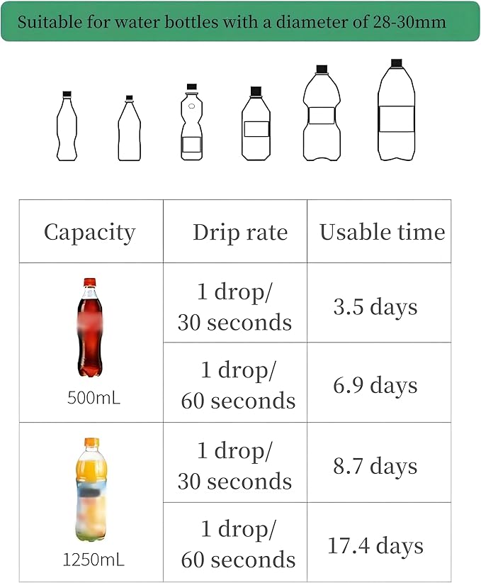 - Adjustable Irrigation Drippers:Vacation watering system for plants with adjustable valve can adjust the dripping speed of 40-60 seconds/drop by tightening the regulator, the continuous release dripping can last for 3-20 days, you can test a few before getting the best results. times so that your plants can grow normally when you travel or go on business trips