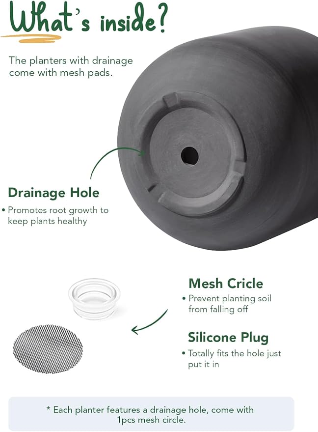 - Drainage Hole & Accessories: Each indoor planter pot features carefully designed drainage hole to maintain optimal soil moisture; The inclusion of silicone plugs and mesh pads provides added convenience, giving you flexibility in how you care for your plants