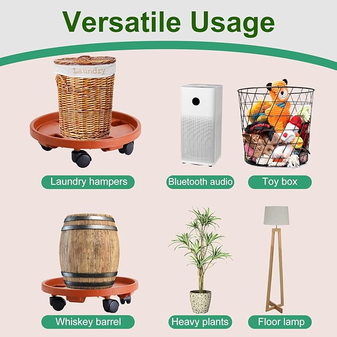 - Versatile Use: This plant caddy with wheels is ideal for both indoor and outdoor use, accommodating garden pots, heavy plants, storage bins, floor lamps, whiskey barrels, or heavy trash cans. Meanwhilr rolling plant stand moves easily across floors, including carpets and lawns, adding a stylish and natural touch to your home while making life more convenient.