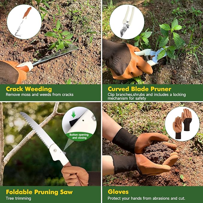 - Garden Tool Sets: The garden tools for gardening comes with folding saw, serrated trower, small trowel, cultivator, hand rake, pruner, weeder, gardening gloves and an tote bag. Made from high-quality aluminum alloy, our gardening tools are built to last and withstands the rigors of frequent use in the garden. With garden gloves for hand protection, the 10 pieces garden kit are easier to fix up your garden.