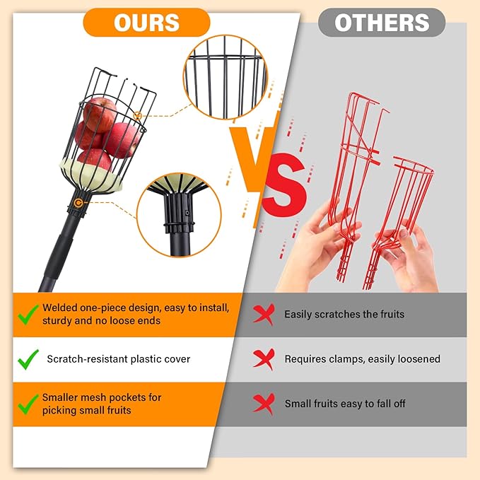 - Durable and Rust-proof: Crafted from commercial-grade and extra-thick 1-inch diameter stainless steel, our fruit picking poles are not only sturdy but also easier to handle compared to traditional wooden poles. The rust-proof design ensures long-term outdoor use without worrying about yellowing hands.