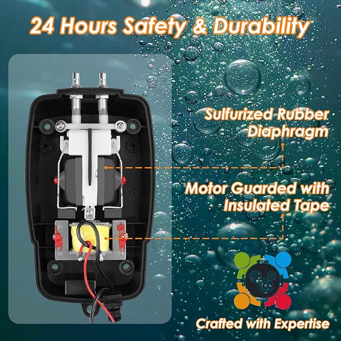 - ULTRA QUIET - This koi pond aerator is designed for minimal noise, featuring a straight air flow path, vibration-absorbing rubber feet, and an interior housing design with a unique texture. You can adjust the air flow using the dial at the top.