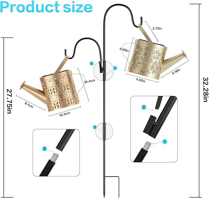 - Quality After-Sales Service: The package includes 2 solar watering cans with hanging solar lights and 2 shepherd's hooks. Each product undergoes rigorous pre-shipment testing to ensure your satisfaction. Should you have any issues, please reach out for a prompt and satisfactory resolution. We are committed to providing our customers with the best possible experience