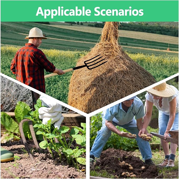 - Multi-Use:The sharp V-shaped tines of the digging fork can quickly penetrate hard soil,Pitchforks For Gardening Suitable For Loosening The Soil, Moving Mulch, Leaves, Straw, Hay Or Garden Debris, Turning Over Compost, Soil And Digging Potatoes Garlic.