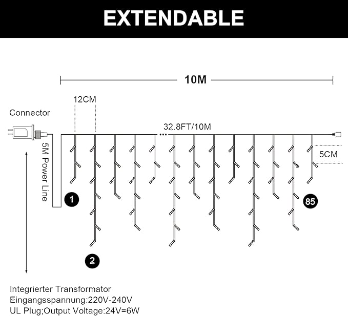 - 【Upgraded 432 LED Christmas Lights】We upgraded the DIY decorative lights according to the feedback from customers' use, the total length is 32.8FT, in order to solve the brightness problem, we increased to 432 LEDs, 85 drops, which is 32 LEDs and 10 drops more than the market, and shortened the distance between the string lights to 12CM, which makes the Christmas lights brighter and more ambient. Perfect for Christmas, Thanksgiving, parties, weddings and other outdoor and indoor decorations.