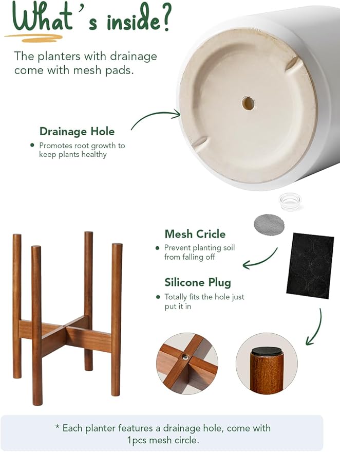 - Complete Set: This bundle includes a 12-inch ceramic planter and a reversible acacia wood stand, combining style and practicality; The drainage hole, removable silicone plug, and protective feet pads help maintain your plants’ health while protecting your floors