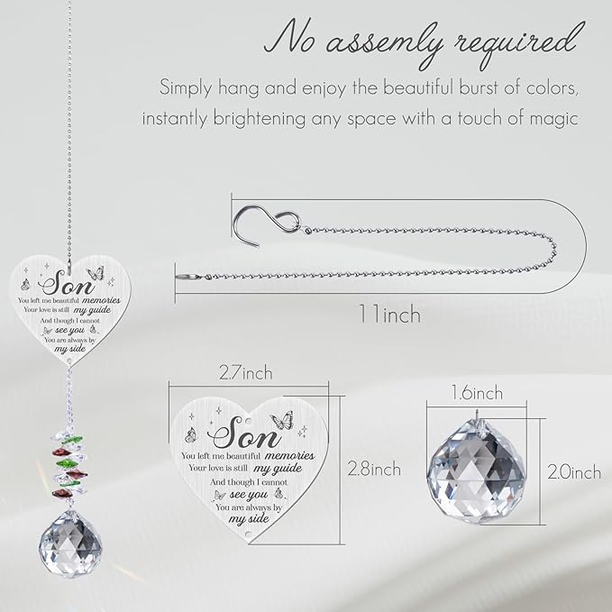 - Suncatchers for Windows Hanging: The memorial hanging crystal suncatcher can be hung anywhere. The perfect commemorative gift does not require any assembly, just peel off the transparent protective film on the stainless steel plate and you can use it.A small, thoughtful gift can speak volumes and show that you care and are thinking of someone who has lost a son at a difficult time, as well as providing something tangible that can be kept and treasured forever.