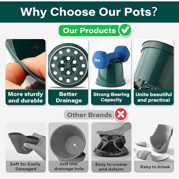 - Sturdy PP Material: Plastic planter pots made of high quality thickened new PP plastic, which will make seed starter pots not easy to be damaged or broken by squeezing. And nursery potting pots for plants also easy to take out the plant, easy to clean. Large plastic garden pots are reusable. Planters are good for your indoor and outdoor gardening needs.
