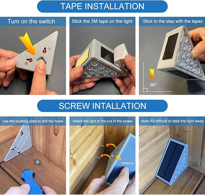 - 【Easy to Install】: No wiring or electricity is required. Solar stair lights need to be installed in a sunny place.solar lights for steps are perfectly decored on garden stairs, patio, yard, deck, porch step and sidewalk. There are 2 installation ways: 1)normal way:just put it in the corner of the staircase,if need,attached to the stairs by 3M sticky tape. 2)anti-theft way:fix the lights on the stair by screws to lock the accessories.