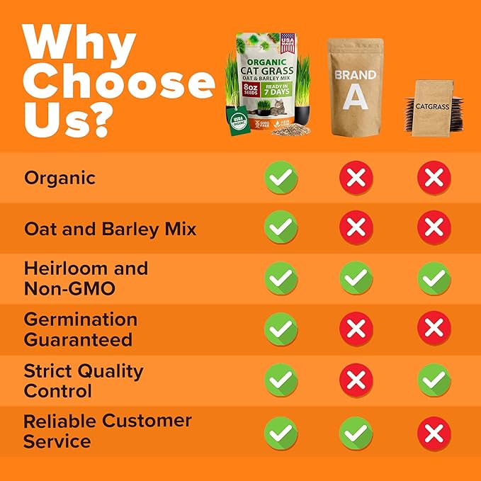 - PREMIUM QUALITY USA-SOURCED ORGANIC SEEDS - Our non-GMO, heirloom seeds are sourced in the USA, ensuring top-tier quality for your pet. These organic cat grass seeds include a mix of oat and barley grasses for variety and health benefits.