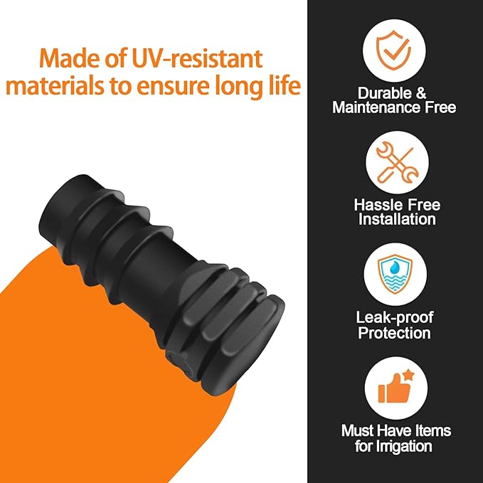 - Versatile and Essential: These end caps are crucial for any drip irrigation system, providing a secure seal to prevent water leakage. They are ideal for both residential and commercial applications, ensuring efficient and reliable operation of the irrigation system. Perfect for small gardens or large-scale agricultural setups, these end caps conserve water and protect the surrounding area, making them a practical choice for a wide range of irrigation needs.