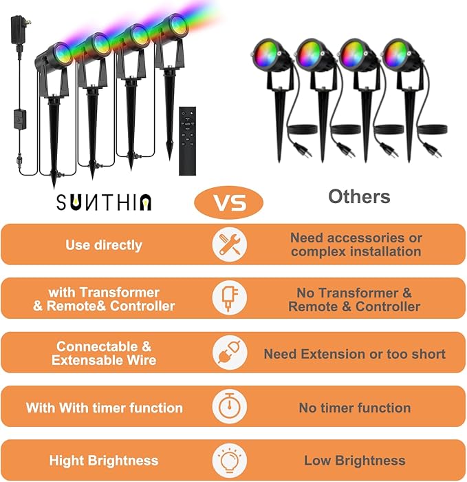 - 【Timer Functions】Utilize the timer feature to automatically turn the lights off at predetermined times, light up your house at night with SUNTHIN outdoor multicolour landscape lights for outdoor decoration for added convenience.