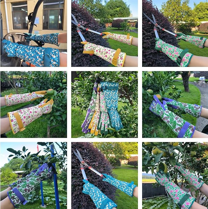 - Multi-purpose Gardening Gloves-Full Protection Rose Pruning Gloves-synthetic leather&canvas gardening gloves for women with bright floral pattern.long cuff pruning gloves provide arm protection against scratches from dry branches and keep dirt and bugs out.There are carefully double thread sewn.The garden gloves are not completely cactus resistant ,please be careful not to get hurt when you using them.Support machine washable.