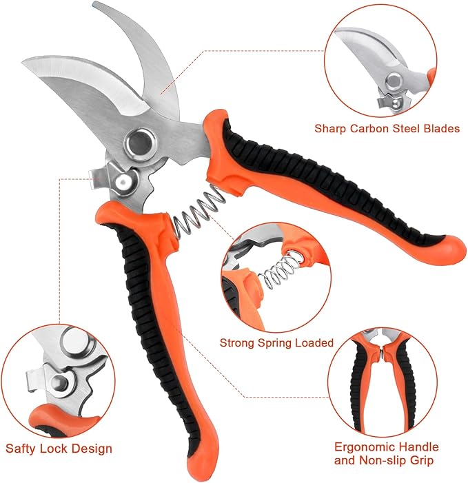 - [Sharp and Safe Garden Shears]:The gardening shears are designed with carbon steel blades that are sharp for precise cutting without harm to plants. The pruning shears for gardening are lightweight and easy to hold, with a strong spring providing leverage for effortless pruning. In addition, the gardening scissors feature a safety lock design for secure storage when not in use.