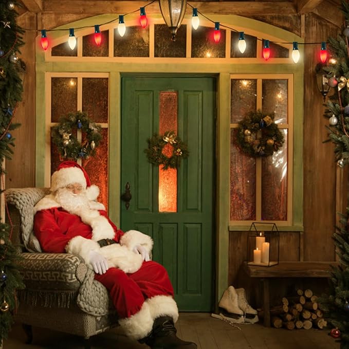 - C7 LED Red White Christmas Lights: 25Ft led christmas outdoor string lights with shatterproof C7 red and white bulbs provide a classic holiday color scheme, perfect for creating a cheerful and traditional Christmas atmosphere. C7 Christmas lights glow a natural warm lights, create a vintage effect or antique ambiance & romantic atmosphere for christmas. led christmas lights outdoor perfect for outside christmas tree garden patio yard cafe tent porch deck party backyard decorations and lighting