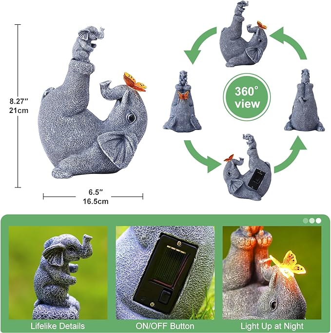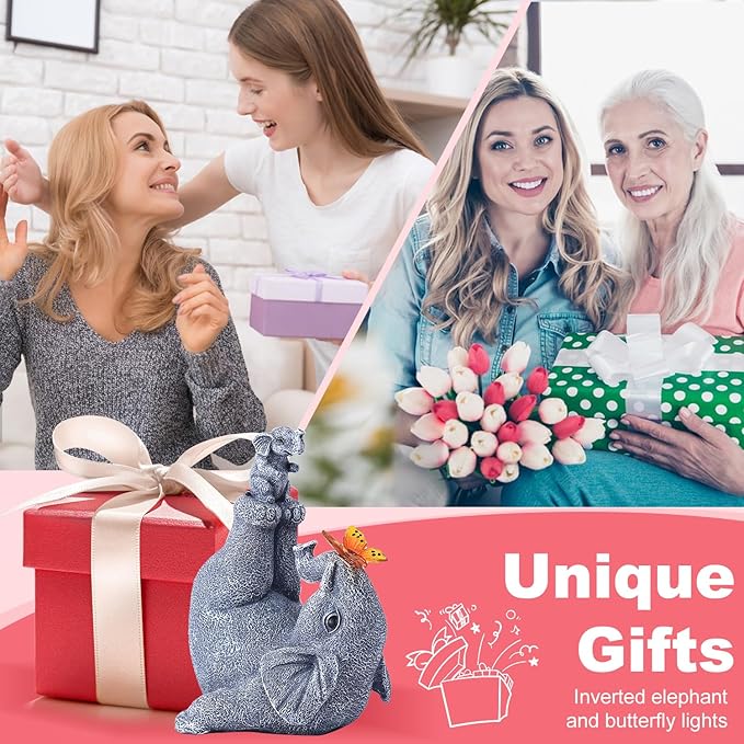 Mommy & Baby Elephant Garden Statue with Solar Butterfly Lights - Perfect Elephant Decor & Ornament for Women, Housewarming Gifts and as Garden Decorations