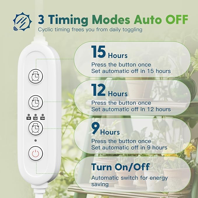 - 3 Timing Modes: The grow lights for indoor plants feature 3 convenient timing options (9H, 12H, 15H), effortlessly set your preferred schedule with a single click of an online timer switch. Enjoy automatic illumination tailored to your plants' needs, helping save your electricity bills while ensuring lush, thriving plants even when you're away on business or vacation