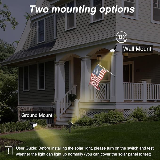 - 【Eco-friendly & easy installation】This solar spotlight stores solar energy for lighting and is versatile, no cables to lay and takes less than 30 seconds to install! Then feel free to illuminate landscapes, pathways, trees, bushes, flags, house facades and more!
