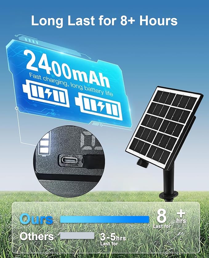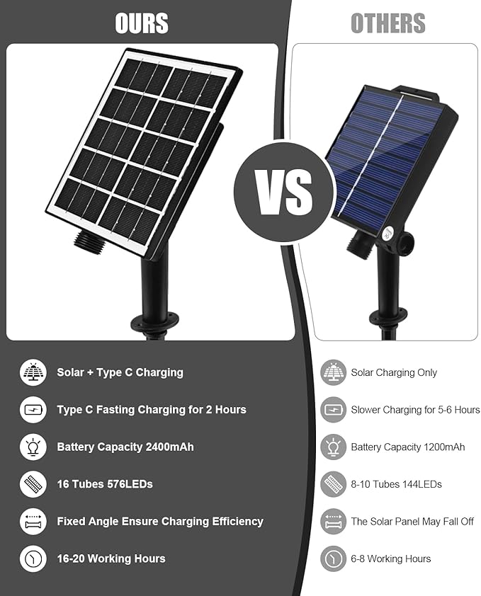 - Easy Operation: The solar panel collects sunlight throughout the day, automatically activating the solar lights at dusk and deactivating them at dawn, ensuring hassle-free operation and energy efficiency. feature a rechargeable 1XAA 1.2V 2400mAh Ni-MH battery, it can be charged with type C cable in rainy and cloudy days