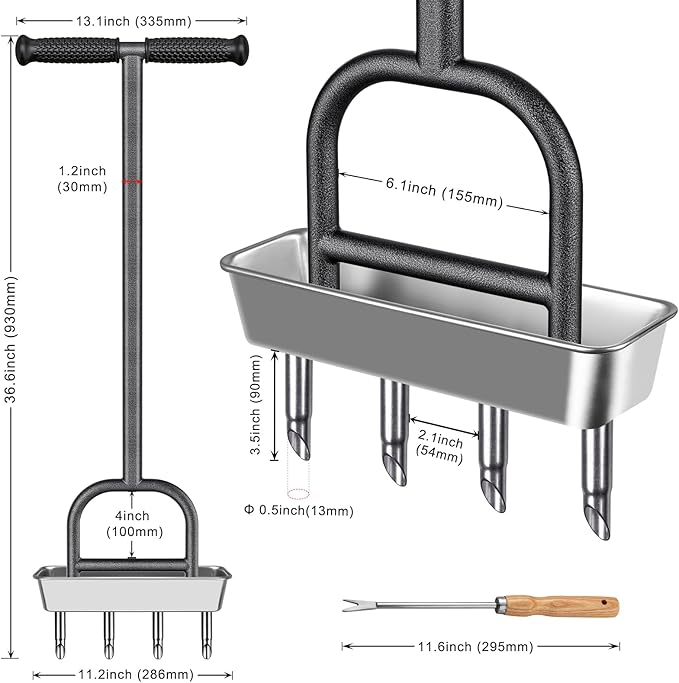 - Stainless Steel Soil Core Storage Tray: The soil storage tray of this manual grass aerating tool is made of non-rusting stainless steel, which prevents rust and deformation. The container design allows for automatic collection of the ejected plugs, saving you time and effort in cleaning the lawn.