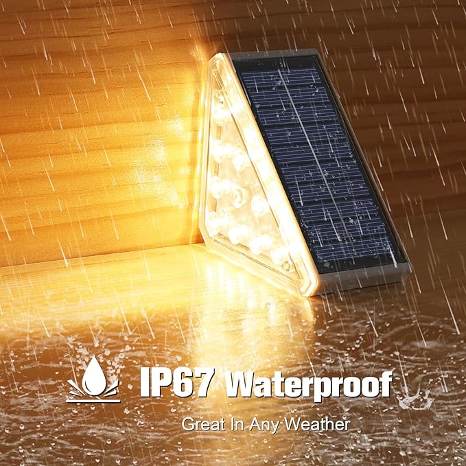- IP67 Waterproof: Crafted from high-quality ABS materials with a fully enclosed integrated design, our step solar lights are IP67 waterproof, ensuring reliable performance in all weather conditions, including rain, snow, and frost. Tip: If you plan to bring the deck step lights indoors during winter, simply place them on your steps without adhesive tape, adapting to your specific needs.