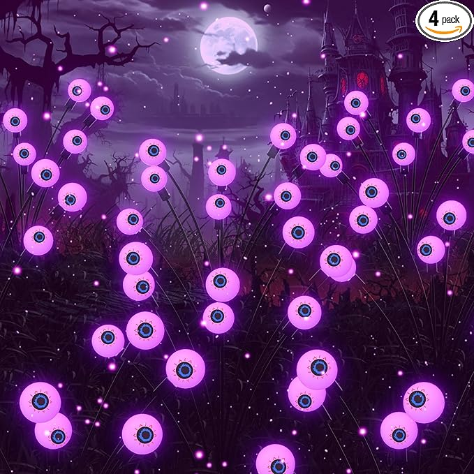 - 【Vivid & Scary Solar Halloween Lights】4-Pack Halloween solar pathway lights, each set with 8 bloodshot eyes, realistic and terrifying, built-in bright eerie lights, give spooky purple glow, these creepy lights add a spooky touch to your Halloween outdoor decor.