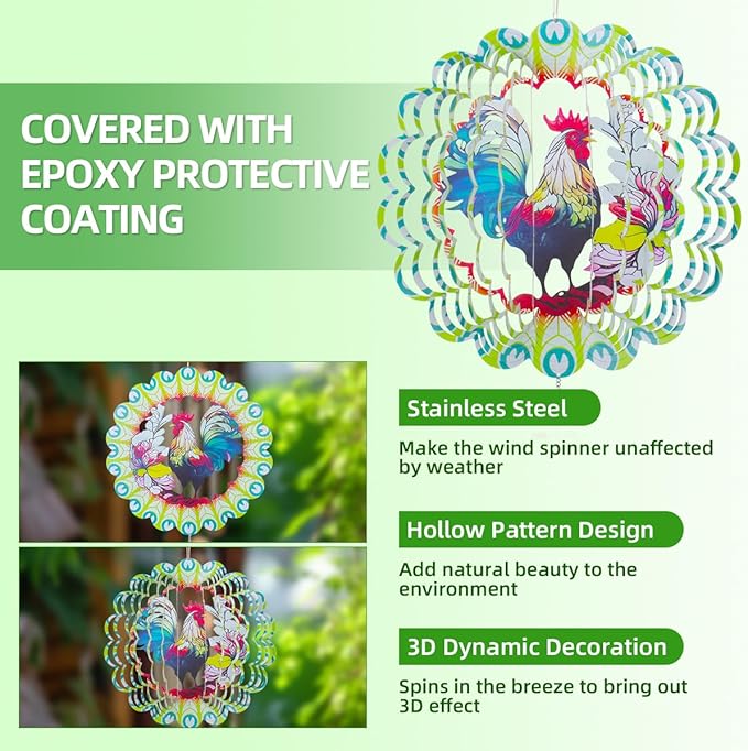 - 【Durable Stainless Steel Wind Spinner】The 30cm/12-inch 3D rooster wind spinner decoration is made of solid stainless steel material and is formed into a bright and shiny shape through laser cutting technology. The surface is coated with an epoxy protective coating, which is waterproof and rust-proof. Whether it is a blizzard, strong wind or scorching heat, the FACIACC wind sculptures is durable and will not rust, fade or fall off.