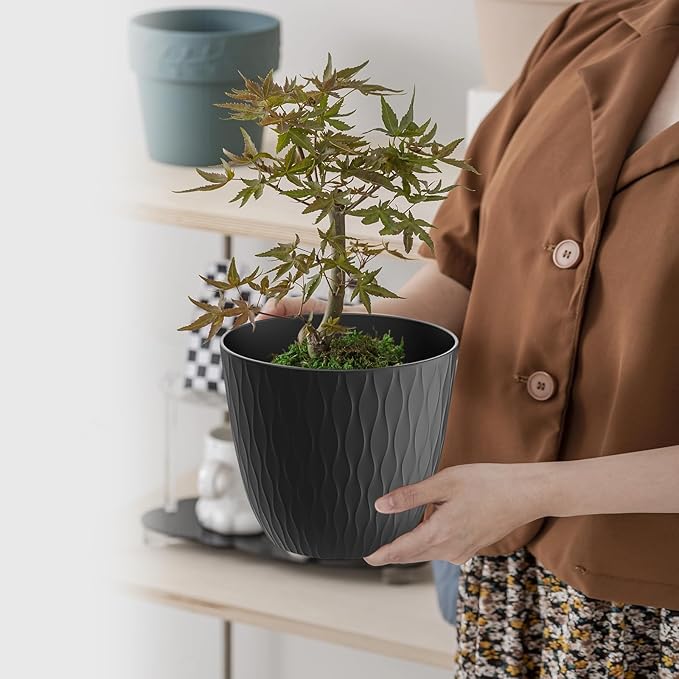 • [Sturdy PP material with Matte Finishing Exterior] There 6 inch plastic plant pots are made of 0.12inch thickness plastic. Be safety placed on the windowsill, home and office. Plastic pots are ligthweight, they tend to retain moisture, so you will water less frequently. And Easy to wash and reuse