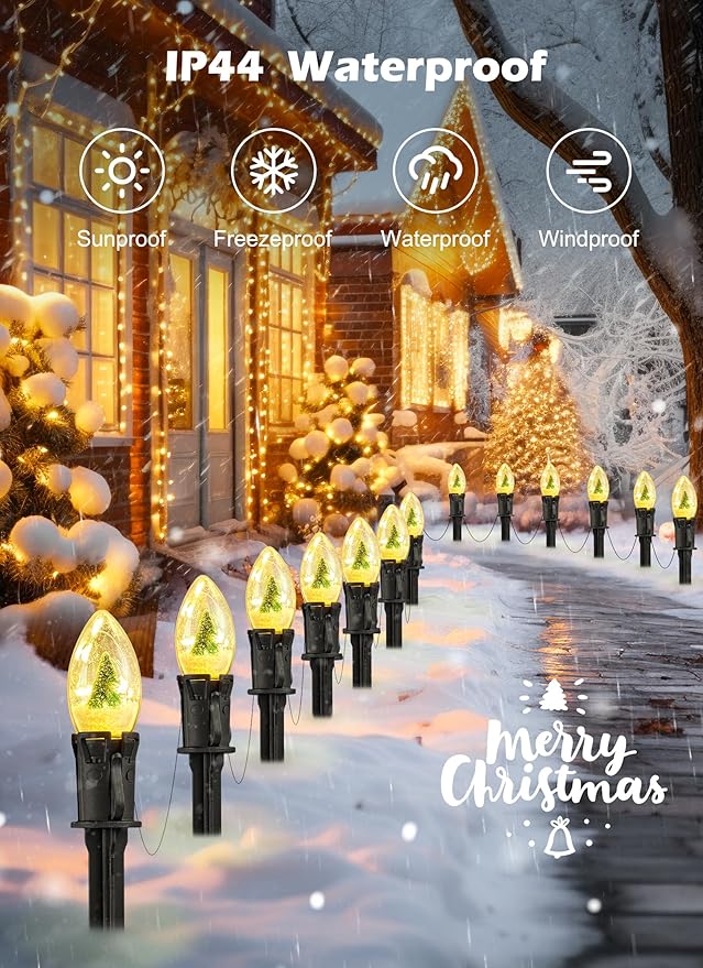 - C9 Christmas Pathway Lights with Stakes: These 25-foot C9 Christmas stake lights feature a classic design with 20 C9 LED bulbs,12-inch bulb spacing. Each bulb contains a mini Christmas tree, foam snowflakes, and five warm white LED beads, creating a festive glow. Includes 20 sturdy black stakes, perfect for holiday garden décor
