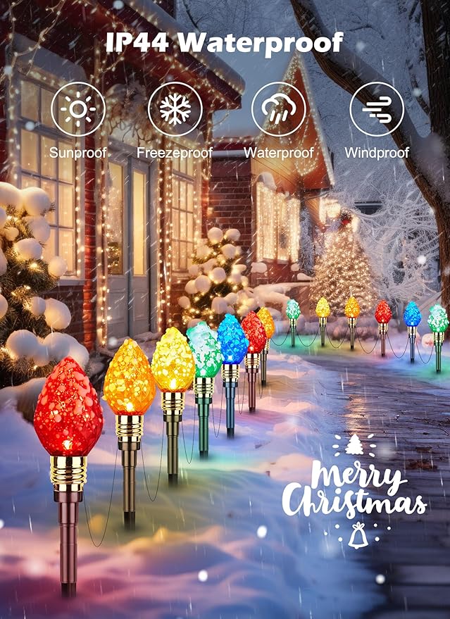- Specifications of Strawberry C9 Christmas Path Lights Outdoor: 4 pack 17.4 feet C9 Christmas stake lights with 10 multicolored C9 bulbs. 21 inches light spacing, 6.7 inches pathway markers, plug in and enjoy it. This Christmas lights for the sidewalk will be great for your pathway, garden, courtyard, holiday decor