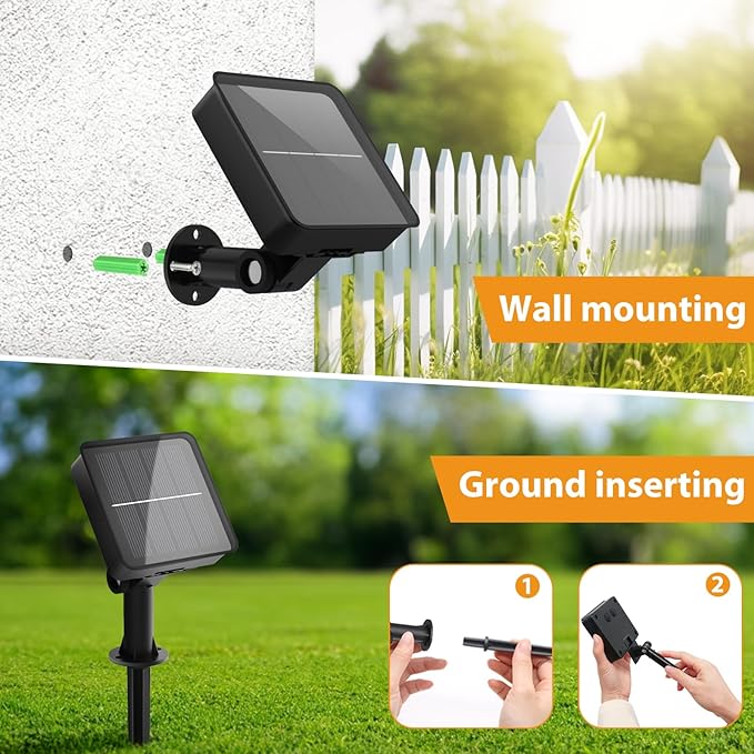 - 2 Mounting Options: Supplied with ground stake, screws and explosion proof nails. Follow the instructions to mount the solar panel on the wall or on the floor for a very quick installation
